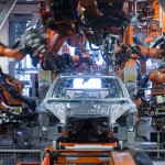 Nach kurzem Fußmarsch durch die Werkshalle sind wir bei einer roboterbetriebenen Fertigungsstraßen ange-kommen. Hier wurden die einzelnen Karosserieteile von Fertigungsrobotern verschweißt, genietet, geklebt und gelötet.