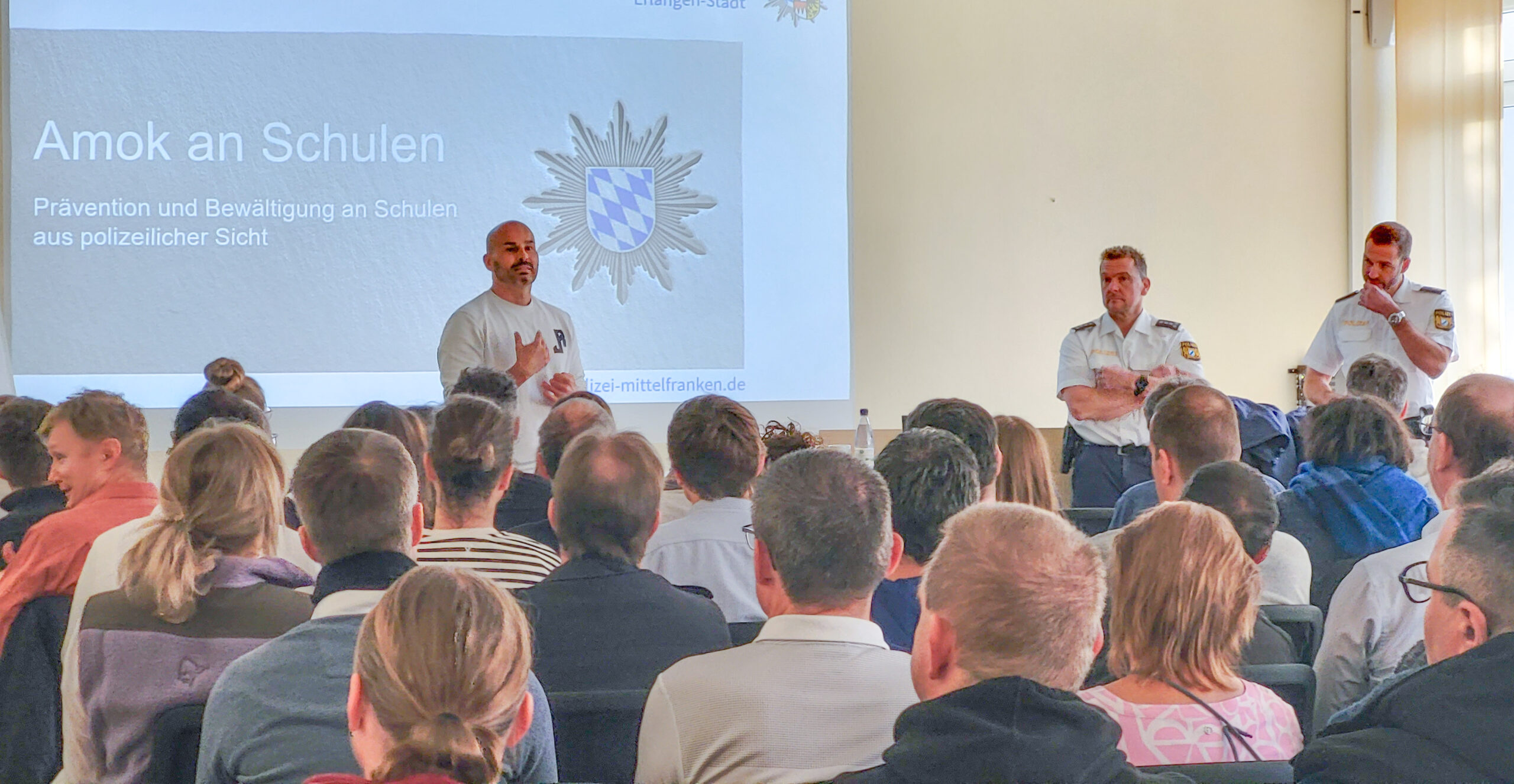 Es folgte eine Aufklärung der Erlanger Polizei zum Früherkennen und dem Vermeiden einer Amok-Situation an Schulen sowie dem Verhalten während einer solchen.
